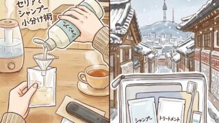 2月の極寒ソウル旅行に向けたパッキング&渡韓準備まとめ!ahamoや大韓航空を利用して荷物を減らすコツ、セリアのパウチを使ったシャンプー小分け術、韓国で役立つNAVERマップやPapagoの使い方を紹介します。
