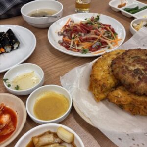 - ピンデトッ(緑豆チヂミ): 外はカリカリ、中はホクホク!油で揚げ焼きにされているのでボリューム満点です。