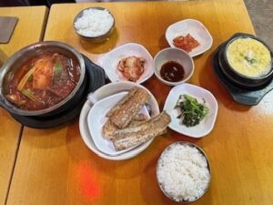 太刀魚の煮付けの他に、たくさんのパンチャン(おかず)が出てきました。特に美味しかったのは、アツアツでふわふわの「ケランチム(茶碗蒸し)」と、サクサクの「太刀魚の唐揚げ」。太刀魚の辛さを和らげてくれるだけでなく、太刀魚の唐揚げも絶品で、箸が止まりませんでした。